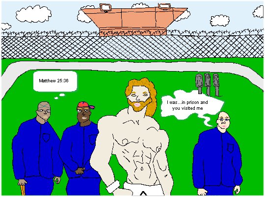 The above picture, (inspired by the prisoner yard inside Marquette Branch Prison) was drawn in pencil because level five (maximum security) prisoners are not allowed hobby craft items. The picture was colored by the webmaster, as suggested and guided (via letter) by the artist.